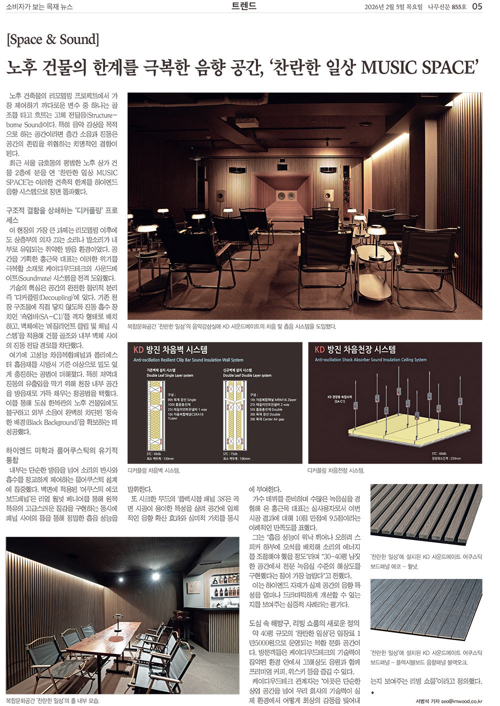company > ♣ 언론보도 > 노후 건물의 한계를 극복한 음악감상실 ‘찬란한 일상 MUSIC SPACE’ / 나무신문 855호 케이디우드테크 사운드메이트 어쿠스틱 보드패널 보도