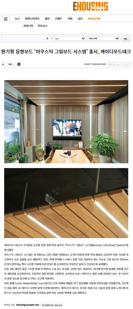 케이디우드테크가 프리미엄 공간을 위한 음향 마감 솔루션 ‘어쿠스틱 그릴보드 시스템(Acoustic Grill Board System)’을 출시했다.