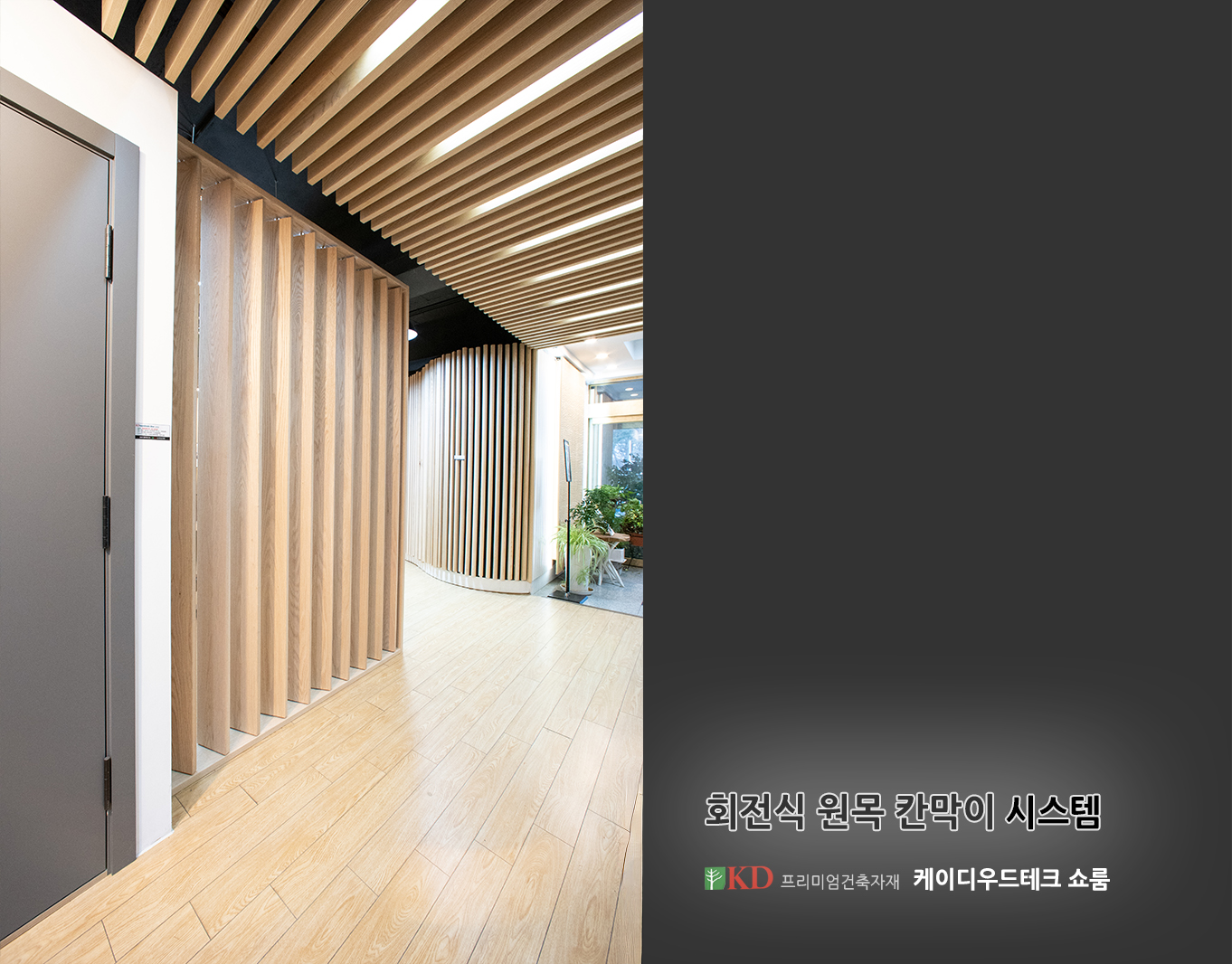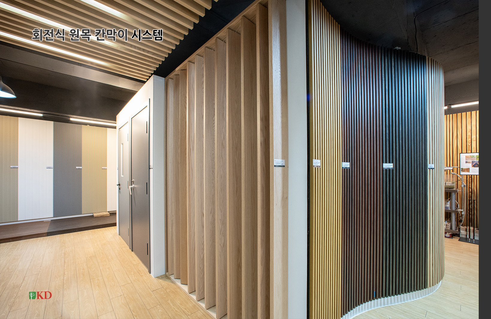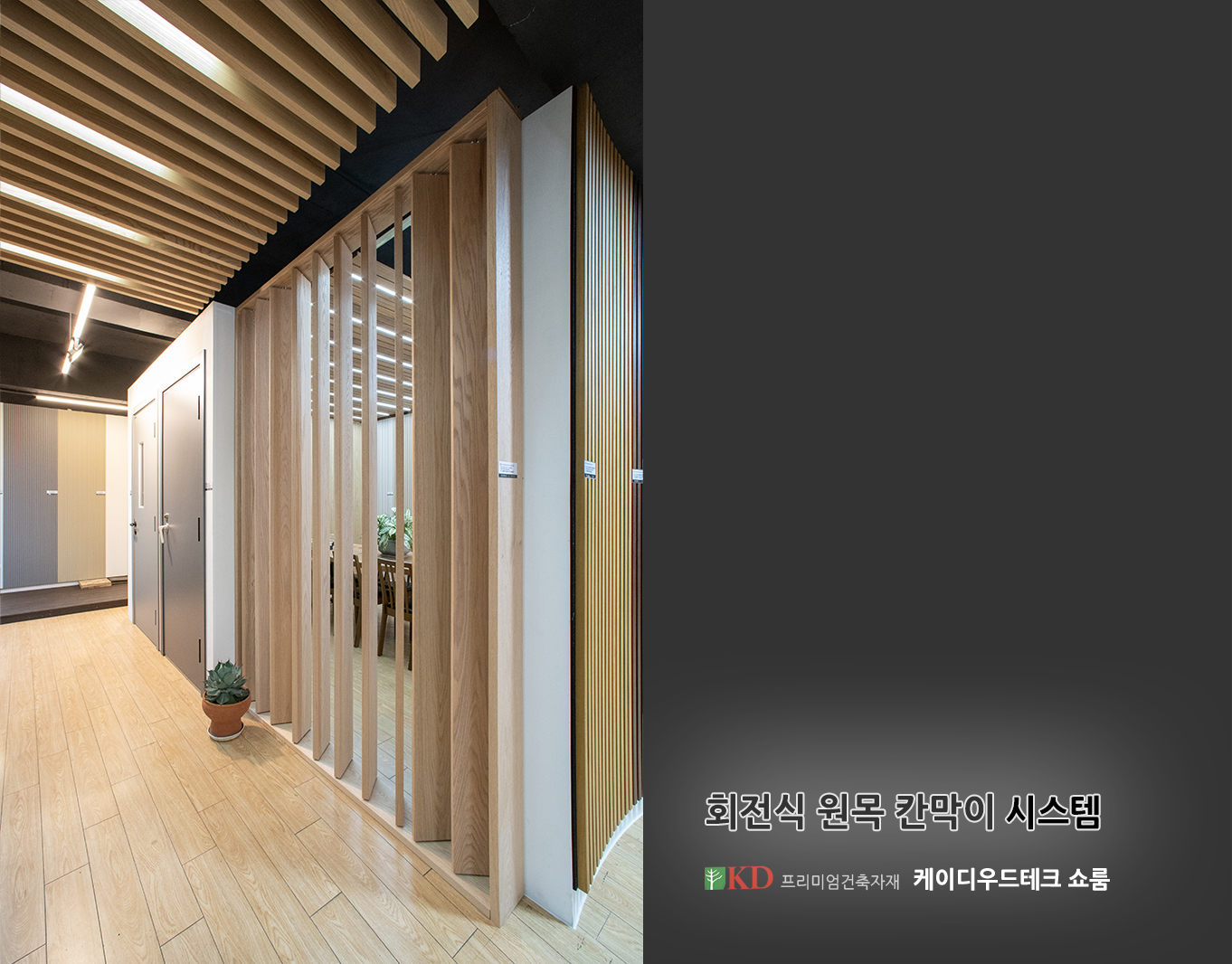 •공간을 분리하는데 있어서 KD가 공급하는 회전식 원목루버 칸막이 시스템은 가장 간편하게 설치가 가능한 시스템입니다.