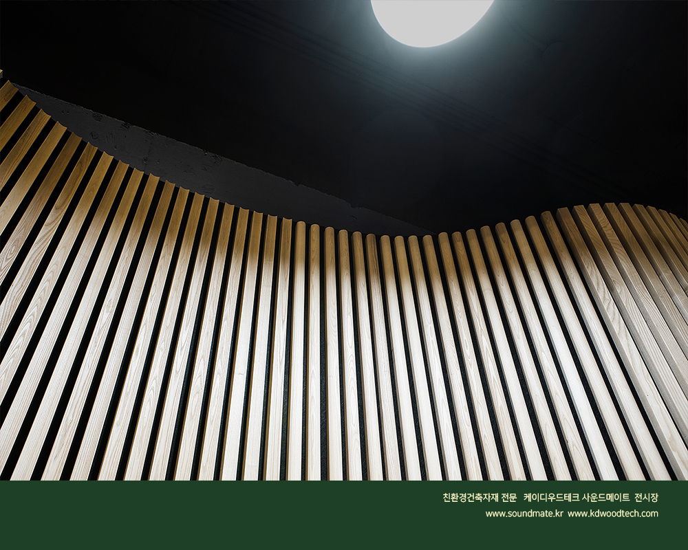 [KD 서울전시장] 케이디우드테크 (사운드메이트) 전시장 : 어쿠스틱 클릭루버 . 라운드벽 인테리어 / 원목루버 설치 특허품 클릭루버 시스템 채용