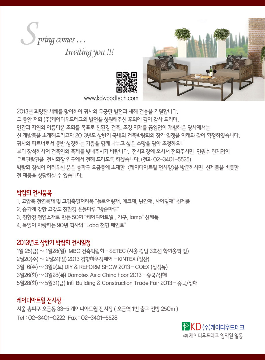 당사로 연락주시면 무료 초청장을 보내드립니다. [이 게시물은 KD우드테크님에 의해 2014-06-24 20:08:54 3333에서 복사 됨]