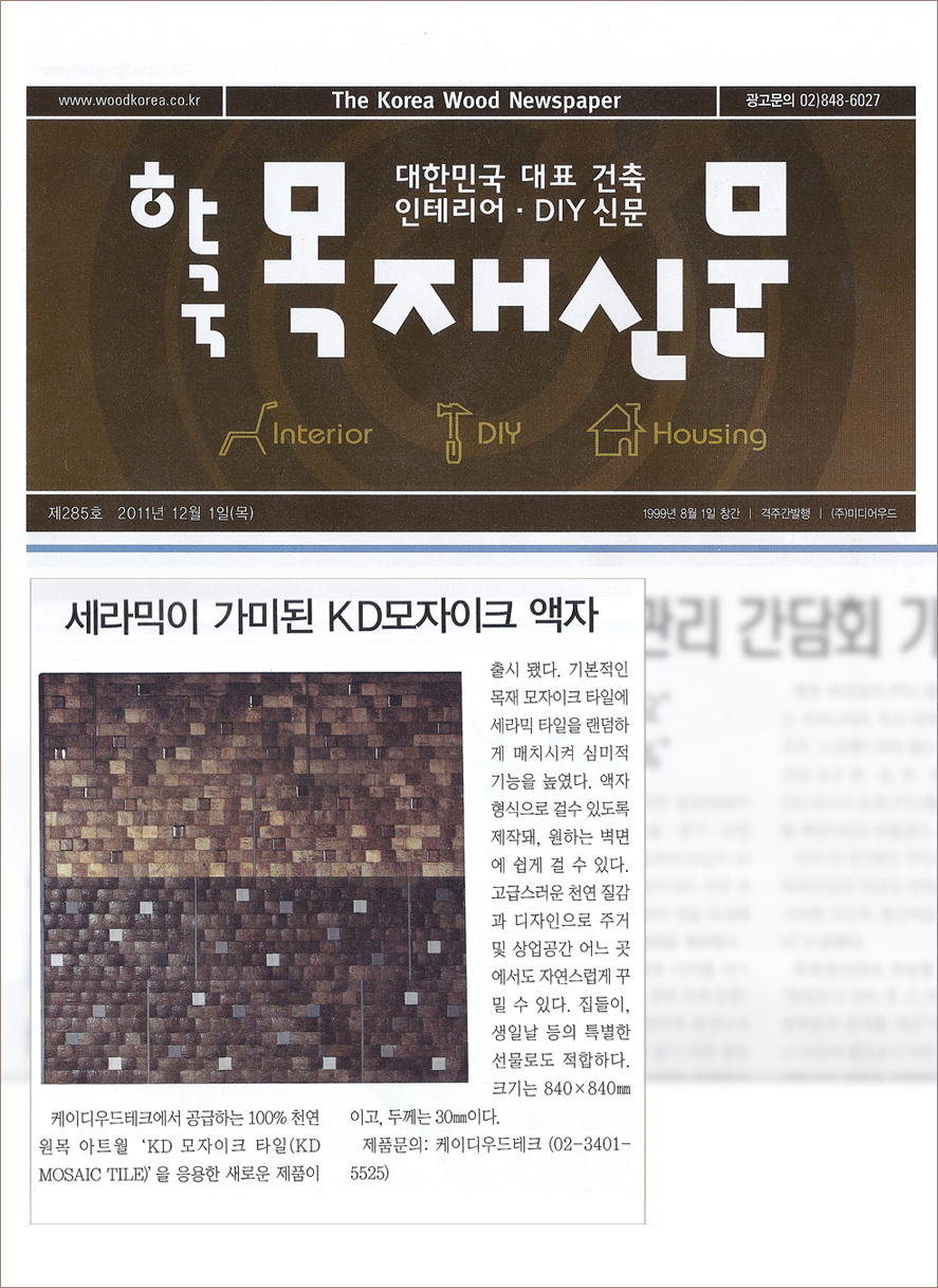 < 한국 목재신문 > 제285호 2011년 12월1일 (목) 16면 에 소개되었습니다. - 세라믹이 가미된 KD모자이크 액자 - 제품문의 : 게이디우드테크 02-3401-5525 [이 게시물은 KD우드테크님에 의해 2014-07-01 22:43:09 3333에서 복사 됨]