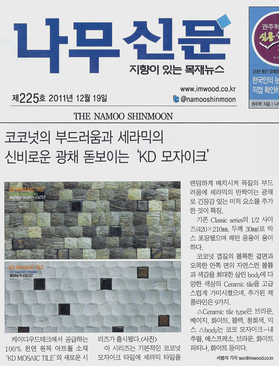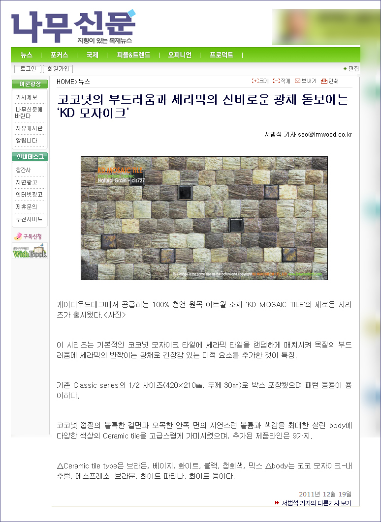 당사의 케이디모자이크 타일의 신제품에 대한 기사가 게재되었습니다.