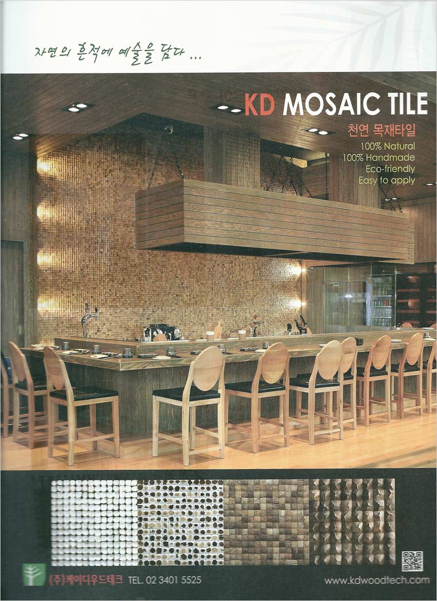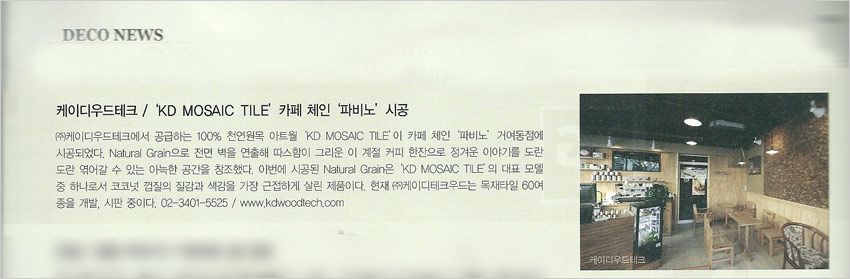 시공되었다. Natural Grain으로 전면벽을 연출해 따스함이 그리운 이 계절 다정한 분들과 커피 한잔으로 정겨운 이야기기를 도란도란 엮어갈 수 있는 아늑한 공간이 탄생되었다. 이번에 시공된 Natural Grain은 “KD MOSAIC TILE”의 대표 모델 중 하나로서 코코넛 껍질의 질감과 색감을 가장 근접하게 살린 제품이다. 현재 ㈜케이디테크우드는 목재타일 60여종을 개발 시판 중이다.