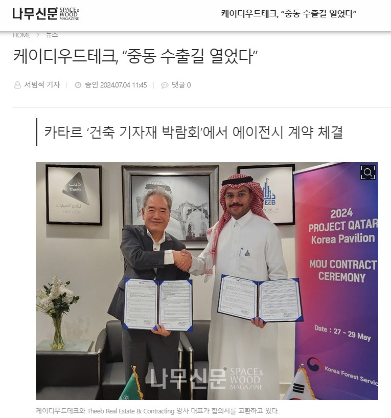 ㈜케이디우드테크는 최근 카타르에서 개최된 ‘건축 기자재 박람회(Project Qatar 2024)’에 참가해 사우디아라비아의 건설회사 Theeb Real Estate & Contracting 사와 에이전시 계약을 체결했다고 밝혔다.