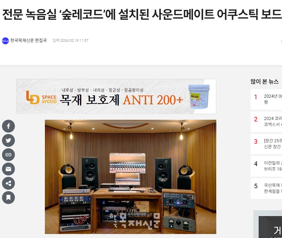 연간 수백 곡의 음원이 제작되고 있는 국내의 수준 높은 녹음실 ‘숲레코드’ 가 뛰어난 음향특성을 가진 케이디우드테크 사운드메이트 브랜드의 어쿠스틱 보드를 설치했다.