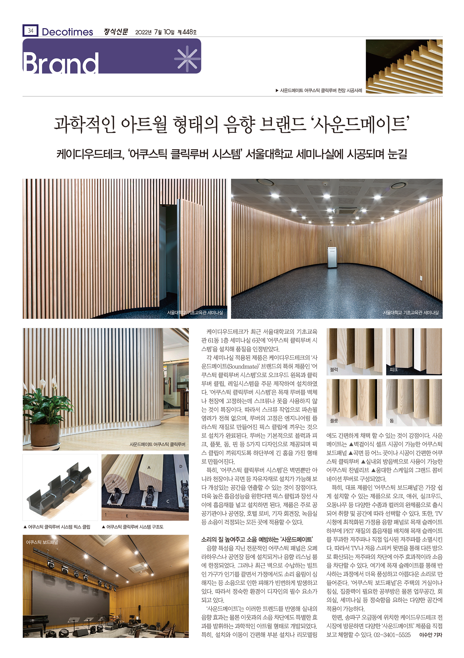 company > ♣ 언론보도 > [ 장식신문 448호 ] 케이디우드테크, 과학적인 아트월 형태의 음향 브랜드 ‘사운드메이트’ ‘어쿠스틱 클릭루버 시스템’ 서울대학교 세미나실에 시공되며 눈길 (2022-07-10일자)