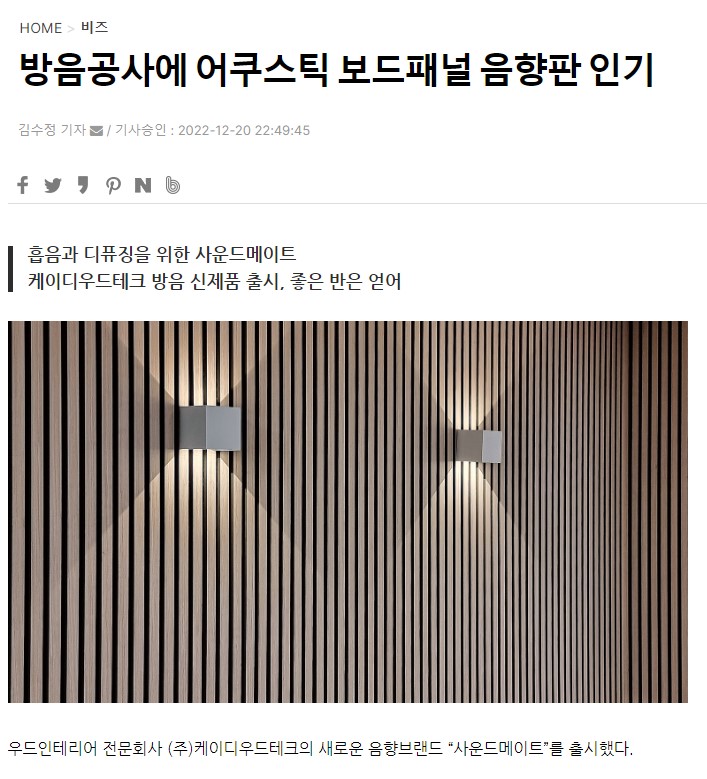 케이디우드테크 방음 신제품 출시, 좋은 반은 얻어
