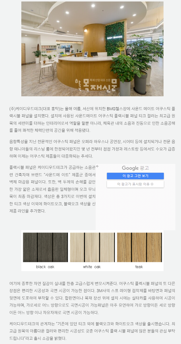 플랙시블 패널은 케이디우드테크가 공급하는 소음관련 건축자재 브랜드 “사운드메 이트” 제품군 중에서 벽체 마감용 패널이다. 또한, 벽 두께의 손해를 감안한 가장 얇은 소재로서 흡음판 일체형이며 오크 무늬목이 최종 마감재다. 색상은 총 3가지로 이번에 설치한 티크 색상 이외에 화이트오크, 블랙오크 색상을 신제품 라인을 추가했다.