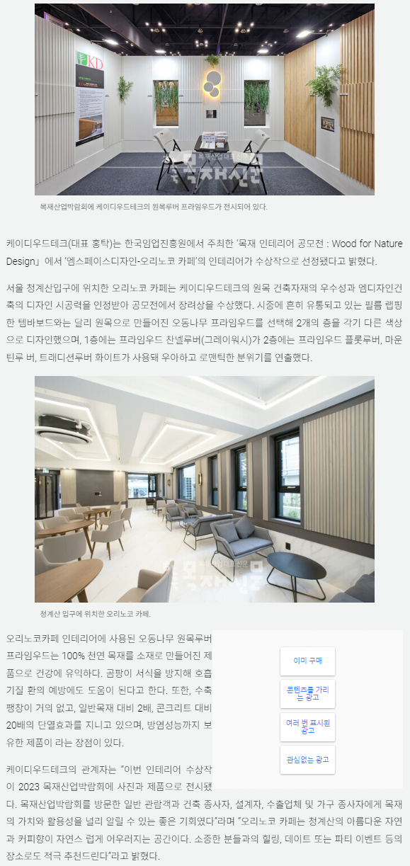 케이디우드테크(대표 홍탁)는 한국임업진흥원에서 주최한 ‘목재 인테리어 공모전 : Wood for Nature Design」에서 ‘엠스페이스디자인-오리노코 카페’의 인테리어가 수상작으로 선정됐다고 밝혔다.