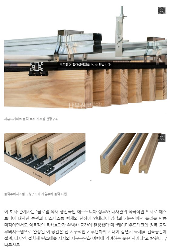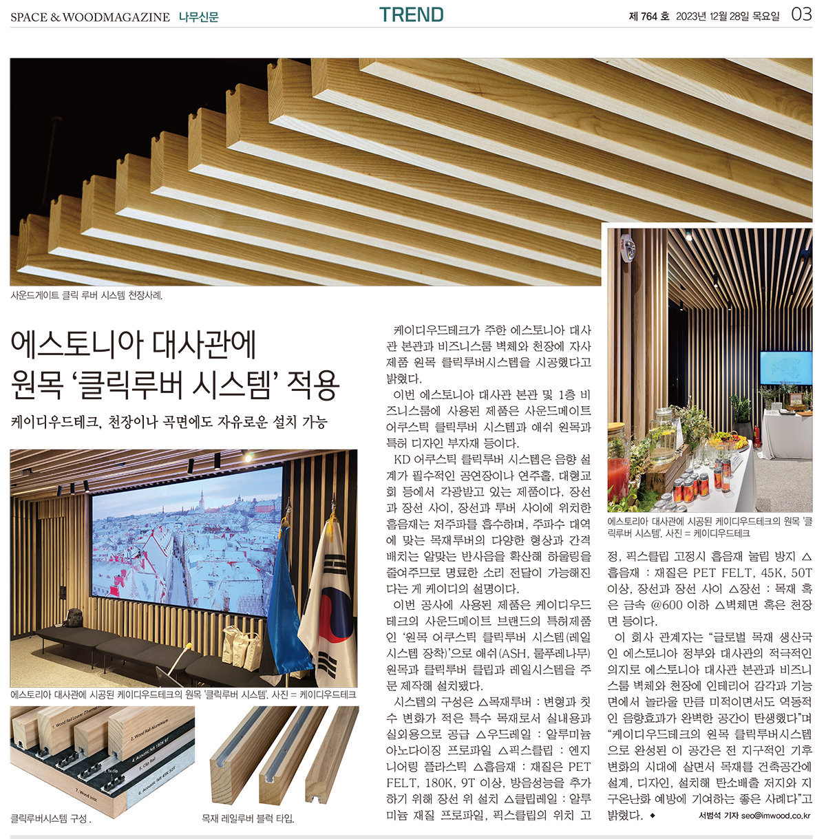 이 회사 관계자는 “글로벌 목재 생산국인 에스토니아 정부와 대사관의 적극적인 의지로 에스토니아 대사관 본관과 비즈니스룸 벽체와 천장에 인테리어 감각과 기능면에서 놀라울 만큼 미적이면서도 역동적인 음향효과가 완벽한 공간이 탄생했다”며 “케이디우드테크의 원목 클릭루버시스템으로 완성된 이 공간은 전 지구적인 기후변화의 시대에 살면서 목재를 건축공간에 설계, 디자인, 설치해 탄소배출 저지와 지구온난화 예방에 기여하는 좋은 사례다”고 밝혔다. /나무신문
