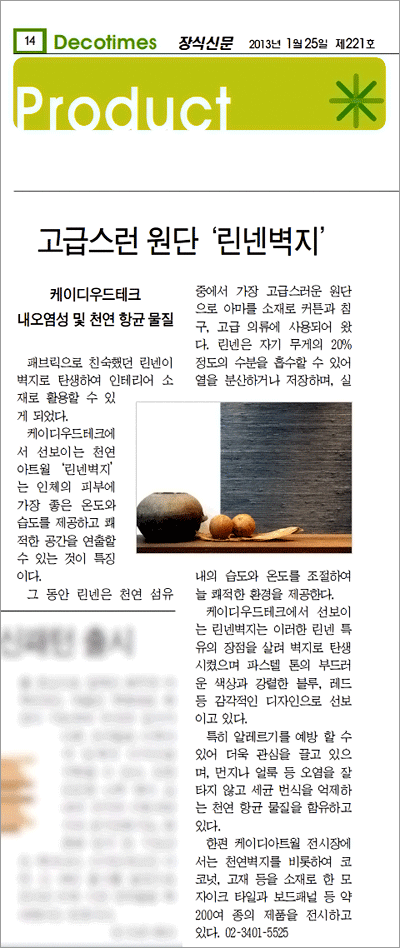 company > ♣ 언론보도 > 장식신문 - 2013,1월호 < 고급스런 원단 > 린넨벽지