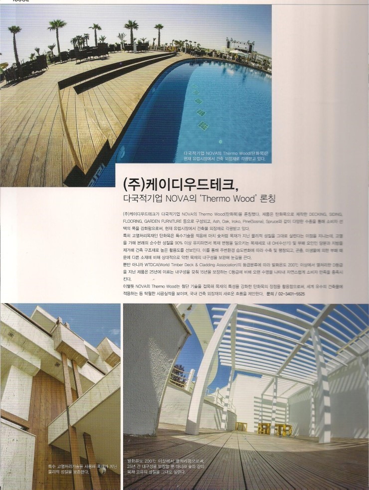 이러한 세계 최고수준의 NOVA 탄화목이 2013 가을 한국에 소개되었다. 케이디우드테크는 다국적 기업 NOVA 그룹으로부터 탄화목으로 만든 DECKING, SIDING, FLOORING을 독점 공급받아 한국 시장에 런칭한다. (문의 : ㈜케이디우드테크 02 3401 5525)