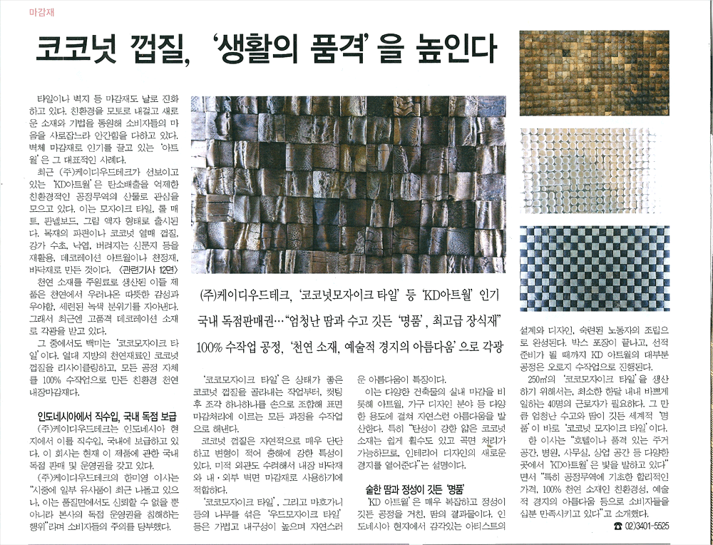 company > ♣ 언론보도 > '코코넛 껍질' 생활의 품격을 높인다 ~ 사인 건축 신문 8월16