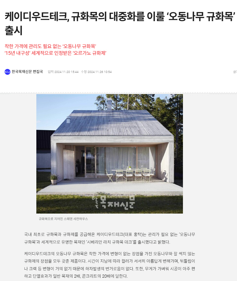 케이디우드테크의 관계자는 “오동나무는 천연림이 아닌 식재한 조림 수종으로 옹이가 없고 목재 품질이 아주 우수하다”며, “일반소나무에 비해 10배 이상 빨리 자라는 속성수로 품질에 비해 비교적 저렴한 가격대에 공급돼 아주 경제적이다”고 말했다.