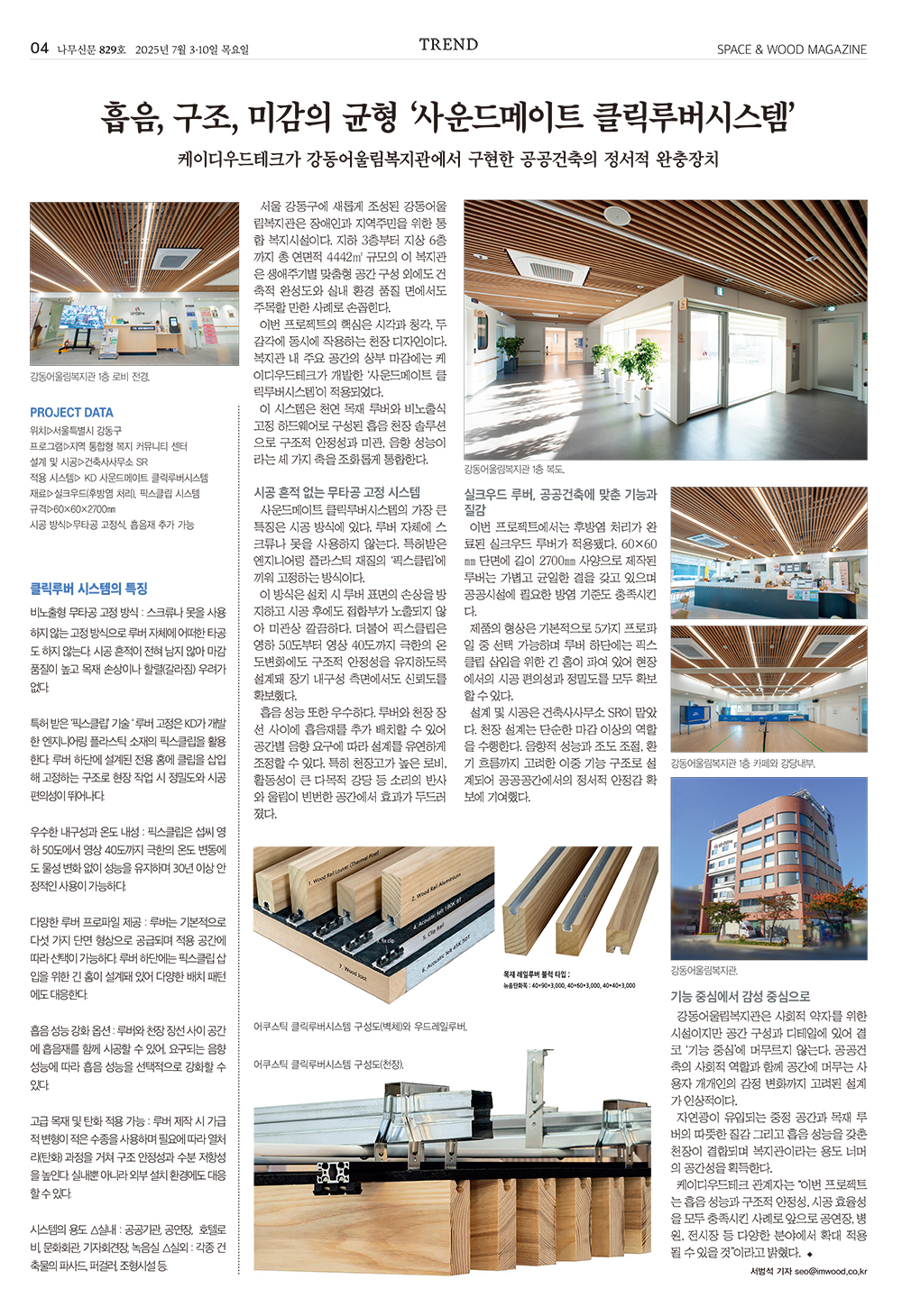 이번 프로젝트의 핵심은 시각과 청각, 두 감각에 동시에 작용하는 천장 디자인이다. 복지관 내 주요 공간의 상부 마감에는 케이디우드테크가 개발한 ‘사운드메이트 클릭루버시스템’이 적용되었다.