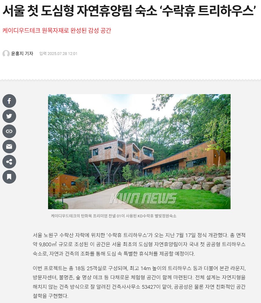 케이디우드테크는 원목의 본질을 살리면서도 국내 친환경 공정을 통해 제작한 건축 자재로, ‘공간을 자연으로 감싸는’ 철학을 실현해왔다. ‘수락휴 트리하우스’는 소형 건축과 감성 건축이 결합된 사례로서, 탄소중립 시대에 걸맞은 자연 회귀형 힐링 공간으로 주목받고 있다.