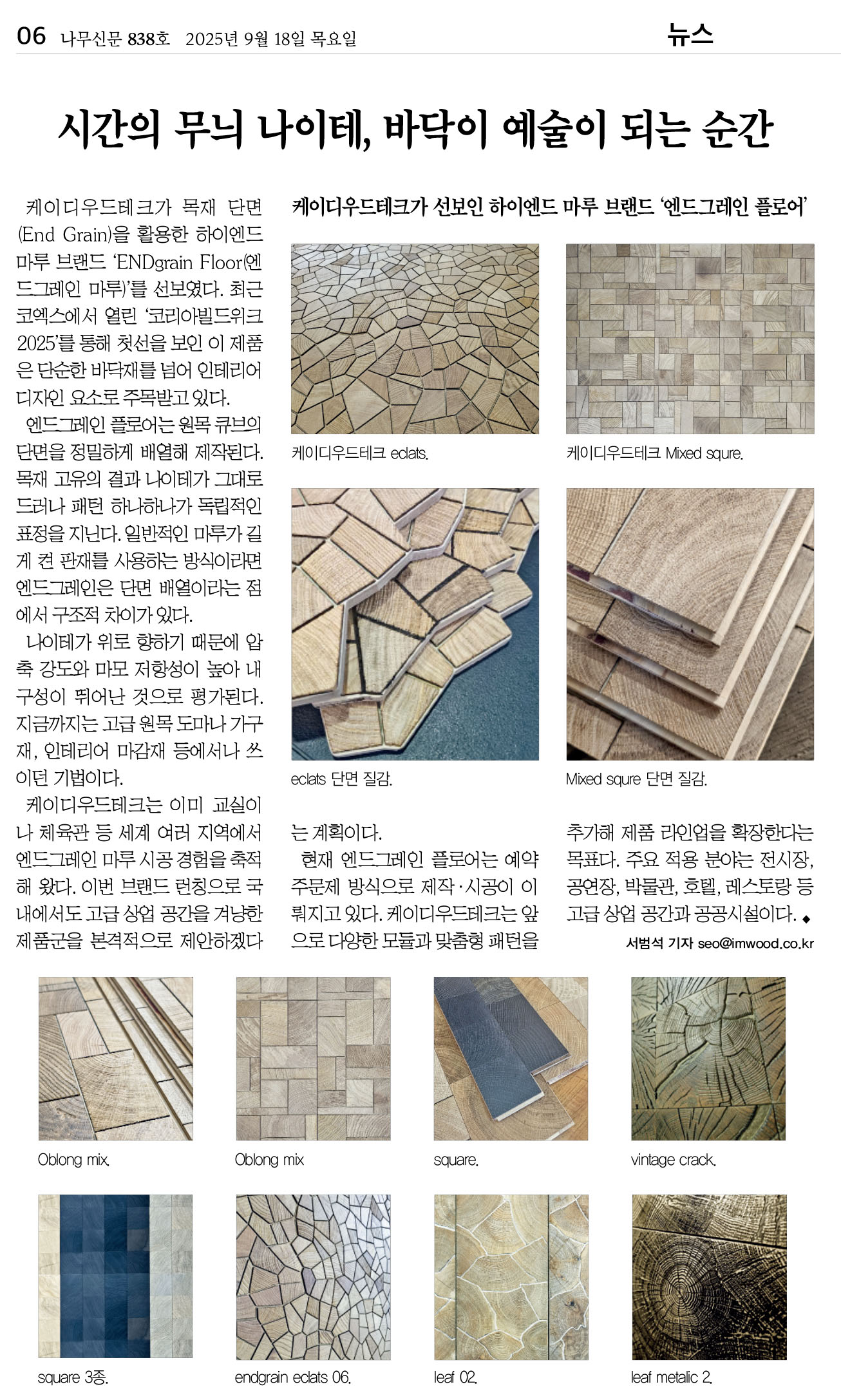 케이디우드테크가 목재 단면(End Grain)을 활용한 하이엔드 마루 브랜드 ‘ENDgrain Floor(엔드그레인 마루)’를 선보였다. 최근 코엑스에서 열린 ‘코리아빌드위크 2025’를 통해 첫선을 보인 이 제품은 단순한 바닥재를 넘어 인테리어 디자인 요소로 주목받고 있다.