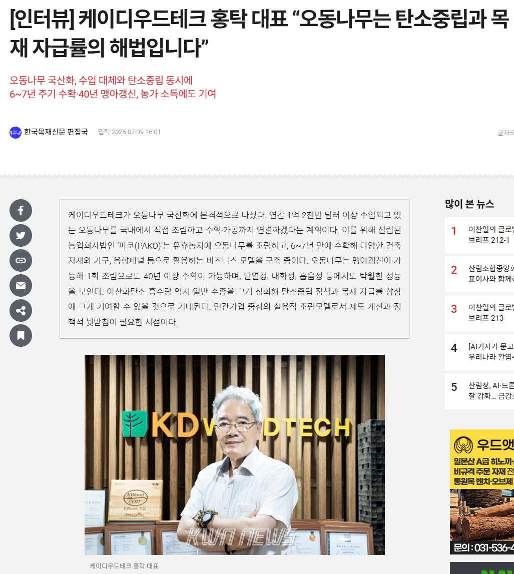 company > ♣ 언론보도 > [인터뷰] 케이디우드테크 홍탁 대표 “오동나무는 탄소중립과 목재 자급률의 해법입니다” [ 목재신문 2025.7.9 ]