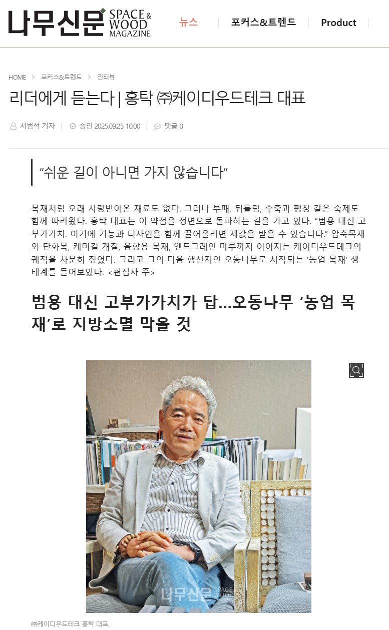 목재처럼 오래 사랑받아온 재료도 없다. 그러나 부패, 뒤틀림, 수축과 팽창 같은 숙제도 함께 따라왔다. 홍탁 대표는 이 약점을 정면으로 돌파하는 길을 가고 있다. “범용 대신 고부가가치. 여기에 기능과 디자인을 함께 끌어올리면 제값을 받을 수 있습니다.” 압축목재와 탄화목, 케미컬 개질, 음향용 목재, 엔드그레인 마루까지 이어지는 케이디우드테크의 궤적을 차분히 짚었다. 그리고 그의 다음 행선지인 오동나무로 시작되는 ‘농업 목재’ 생태계를 들어보았다. <편집자 주>