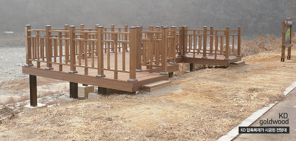KD 압축탄화목재 골드우드 구조재는 어떤 환경에서도 최상의 내구성을 자랑합니다. 미려한 목재의 질감과 뒤틀리거나 트지 않는 외관은 늘 한결같은 아름다움을 제공합니다. KD 압축탄화목 데크와 함께 동일한 수종으로 설치된다면 경관조경에 일체감을 조성합니다. 경도가 높은 일반 목재 사용시 표면 할렬이나 터짐에 의해 발생하는 가시 등에 의한 부상이 없습니다. 전체적으로 단단한 압축목재임에도 불구하고 KD 압축탄화목재 골드우드 재질은 탄화과정에 의해 목질부의 날카로움을 부드럽게 완화시켜줍니다.이는 어린이 놀이시설등에 아주 접합한 특성입니다.