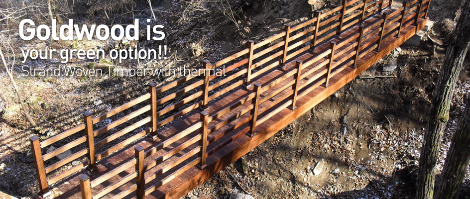 카본우드가 실내용이라면 골드우드는 전적으로 외부에 노출되는 환경에 사용되도록 개발되었습니다. 추운 겨울과 고온 다습한 여름을 보내야 하고, 자외선에 지속적으로 노출되어야 하며,수많은 미생물과 해충, 곰팡이 등을 비롯한 각종 부패균, 그리고 대기 중의 화학 물질 들에 대응하기에는어려움이 많았습니다. 그래서 개발된 목재가 골드우드입니다. 골드우드는 카본우드의 기본 제작 공정에 몇가지의 케미컬(Chemical) 프로세스와 엔지니어링(engineering) 프로세스가추가됩니다. 그러나 가장 중요한 추가적인 요소는 고열에 의한 탄화처리입니다.이러한 결과로 골드우드는 극한의 환경에서도 버틸수 있게 되었습니다. 예를 들어 높은 산이나 바다 한가운데에 설치된 풍력발전기의 날개에 적용된 골드우드는영하 수십도의 추위와 250km/h 에 달하는 허리케인에서도 20년을 버티도록 설계되어 있습니다.골드우드로 만들어진 교량으로 차량들이 다니는 날도 그리 멀지 않은 장래에 가능하리라 생각됩니다.