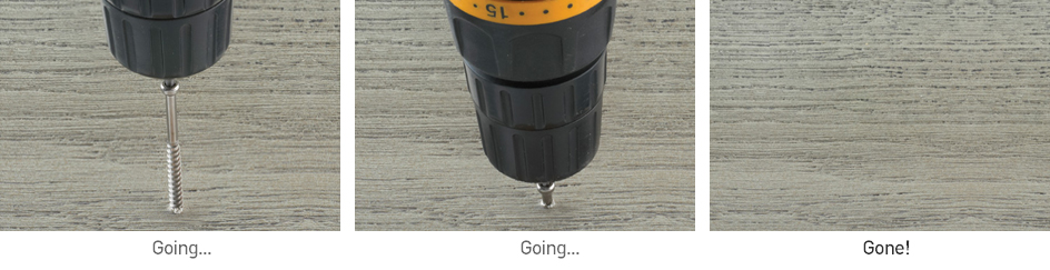 밀보드는 시공후 스크류 자국이 남지 않습니다. 탄성을 지닌 Lastane® 표층은 스크류가 통과할 때 잠시 늘어났다가 스크류가 코어까지 박히면 스스로 아물어 버립니다. |