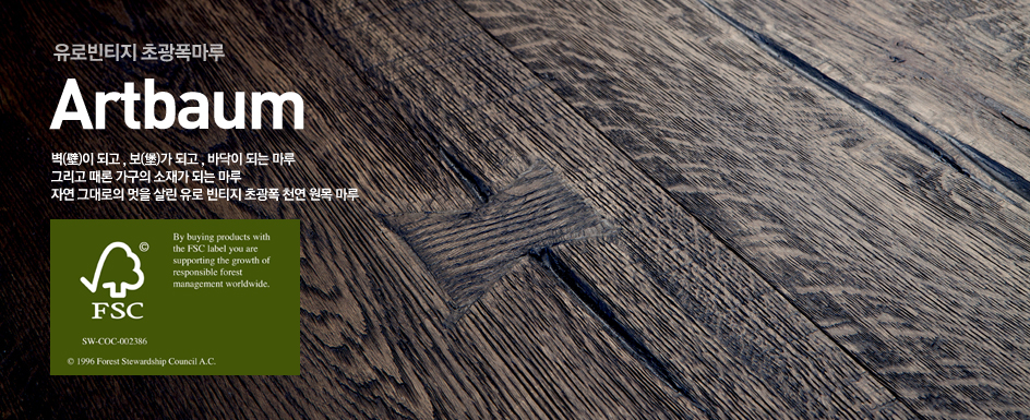 아르바움은 지속적인 벌채가 가능하도록 관리되는 조림목을 사용합니다. 또한 나무의 옹이부분이나 결함있는 부분을 제거하지 않고 예술적인 터치를 통해 목재의 성장 과정에서 비롯된 세월의 흔적을 유로 빈티지의 기법으로 표현합니다. 기존의 마루 생산이 원목의 30% 수율로 제조 되었다면 아르바움은 60% 이상의 수율로 활용됩니다. 버려지는 목재 자원을 아껴서 지구 온난화를 방지하는 탄소 장기 저장기술에 이바지하는 친환경 녹색 제품입니다.