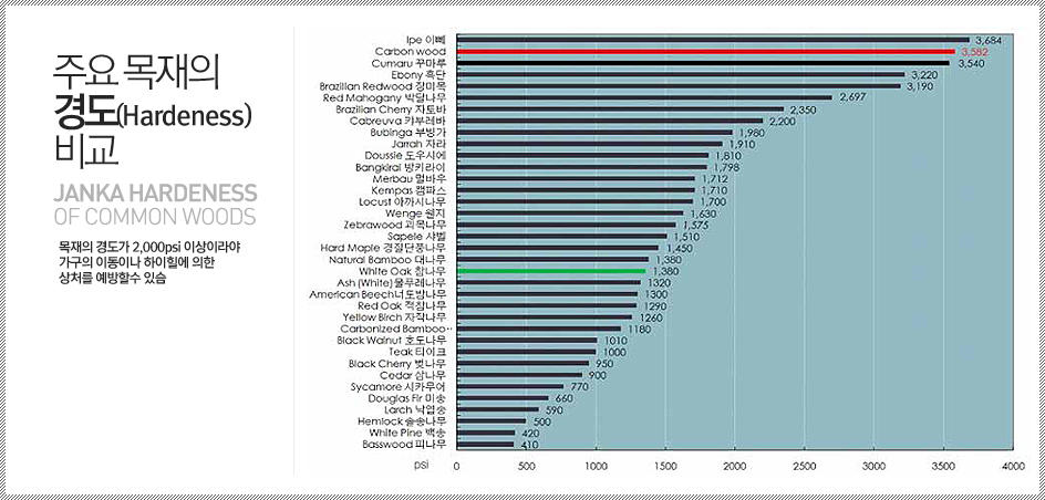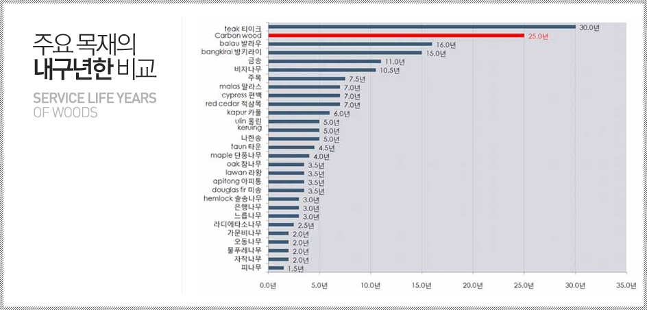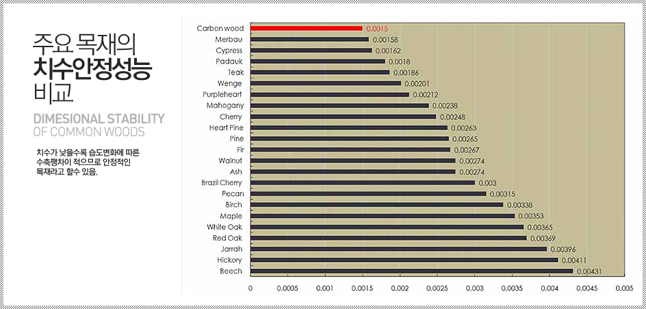 2. 천연목재가 갖고 있는 대부분의 단점을 보완하였습니다. (1) 목재의 밀도가 균일하여 뒤틀림이나 변형이 없습니다. 일반목재의 경우 한그루에서도 최대 밀도 편차가 50%에 달하나카본우드는 5% 이내입니다. (2) 경도가 참나무 대비 2.6배나 강하여, 마루재나 데크재 등으로 사용시 하이힐이나 가구의 움직임으로부터 표면 손상을 방지합니다. (Janka Hardness : 참나무 1,320psi, 카본우드 3,582psi) (3) 대기중 수분에 의해 목재가 수축팽창하는 것을 억제하는 기술을 적용하여 현존하는 모든 목재 중에서 가장 높은수축 팽창 억지력과 치수안정성능을 나타냅니다.