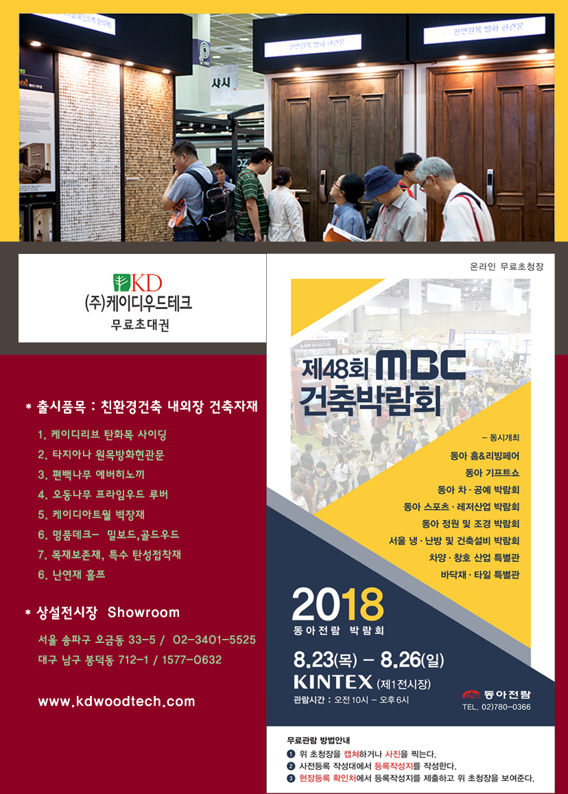 친환경 건축자재 전문회사인 (주)케이디우드테크는 킨텍스에서 열리는 MBC 동아전람 건축박람회를 통하여