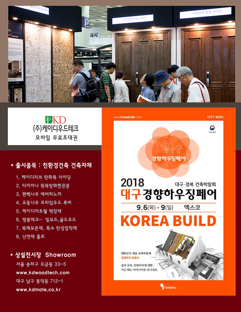 친환경 건축자재 전문회사인 (주)케이디우드테크는 대구 엑스코 에서 열리는 대구 경향하우징 페어를 통하여