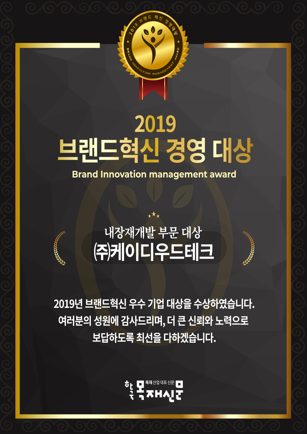 ‘2019 브랜드혁신 경영 대상’은 지속적인 품질개선과 서비스의 질 향상을 통해 소비자에게 만족감을 선사하고 올바른 목재문화의 진흥을 위해 공헌한 기업들을 선정 발표하는 행사다.