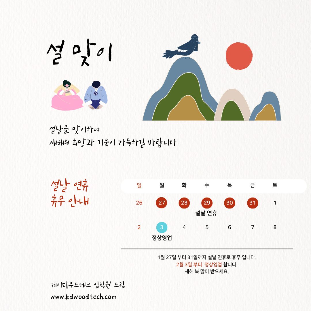 1월 27일 부터 31일까지 설날 연휴로 휴무 입니다.