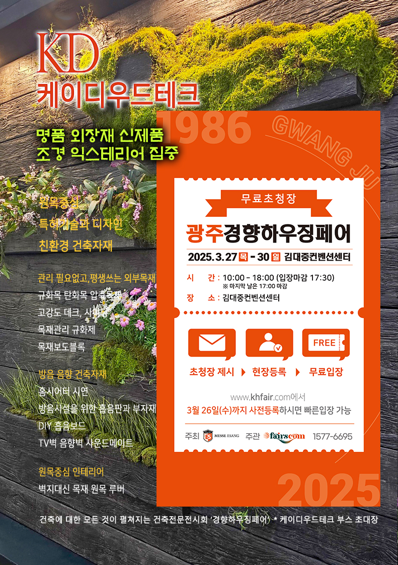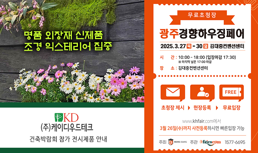 광주경향하우징페어 2025 , 케이디우드테크 참가 전시안내 및 무료초대장 게시글을 twitter로 보내기 게시글을 네이버로 북마크 하기 공유하기