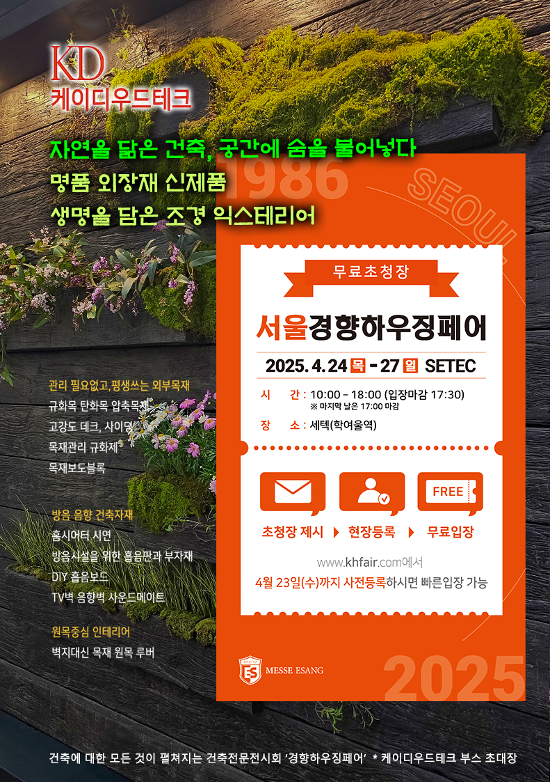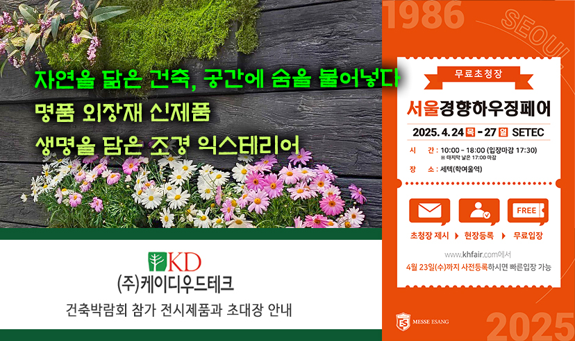 company > 공지사항 > [케이디우드테크 초대장] 자연을 닮은 건축, 공간에 숨을 불어넣다 2025 서울경향하우징페어에 여러분을 초대합니다.