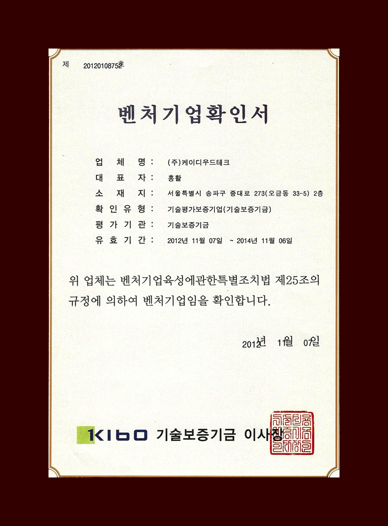 company > 공지사항 > (주)케이디우드테크 - 벤처기업 인증