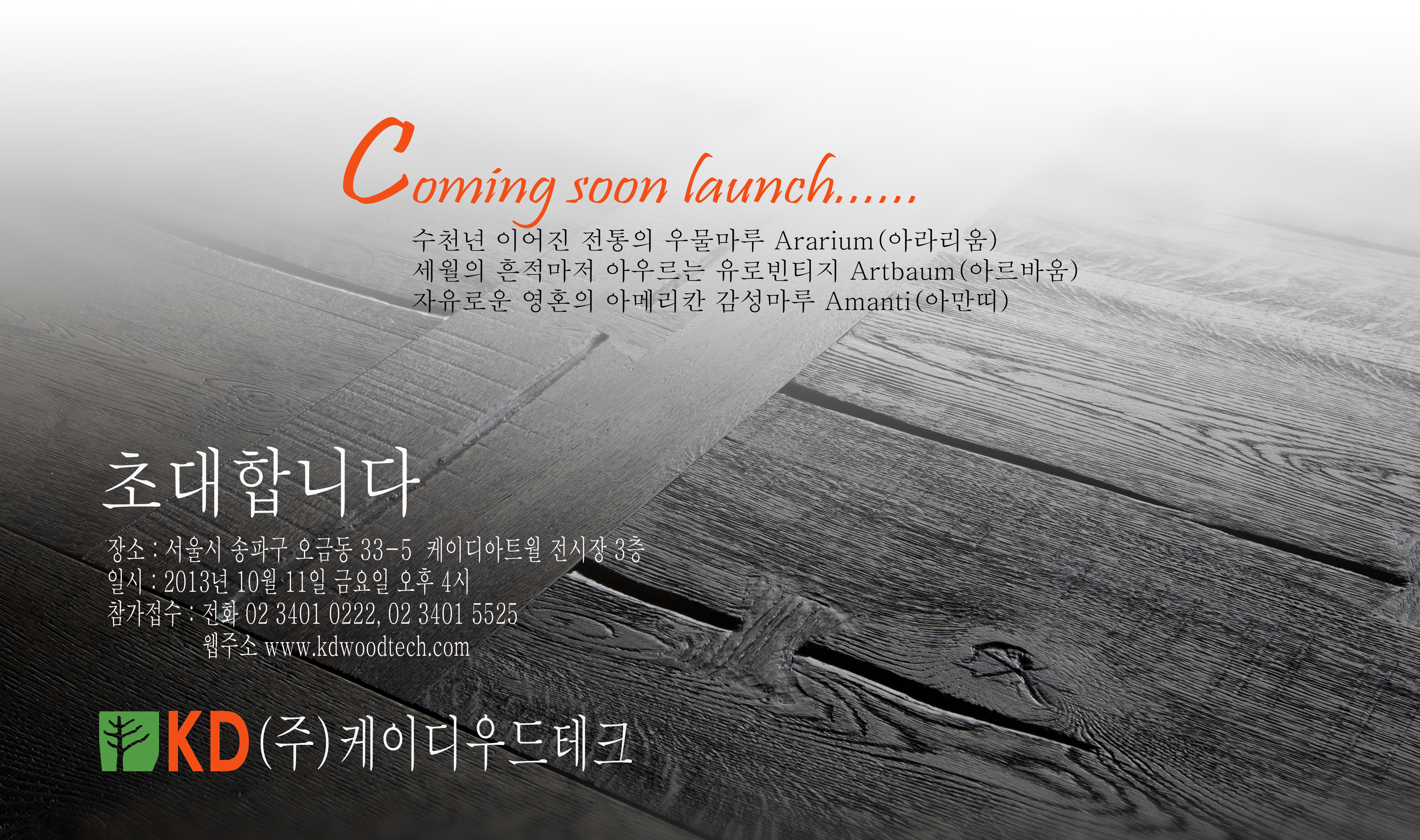 (주)케이디우드테크에서 최고급 프리미엄 마루 브랜드 3종을 공식 런칭합니다. 모든 제품은 장인의 손길아래 핸드터치 마감이며, 천연오일로 도색되었습니다.
