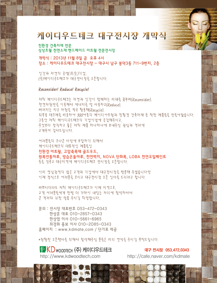 여러분들의 크나큰 사랑에 보답하기 위해서 케이디우드테크의 대표적인 제품들인 친환경 아트월, 고압축목재 골드우드, 원목전통마루, 방습온돌마루, 천연벽지, NOVA 탄화목, LOBA 천연오일페인트 등을 갖추고 영남지역에 케이디우드테크 전시장을 오픈합니다.