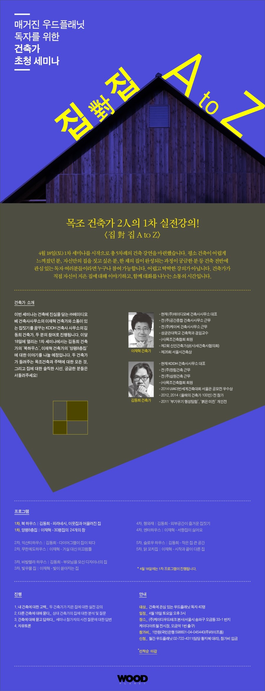 우드플래닛에서는 4월 18일(토) 1차 세미나를 시작으로 올해 총 5차례의 건축 강연을 마련했습니다.