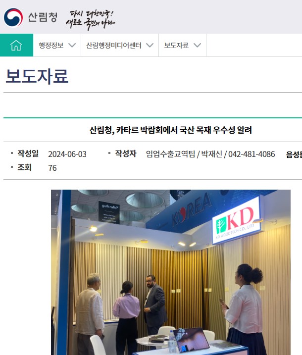 산림청(청장 남성현)은 지난달 27일부터 30일까지 4일간 카타르(도하)에서 개최된 “건축 기자재 박람회(Project Qatar 2024)”에 참가해