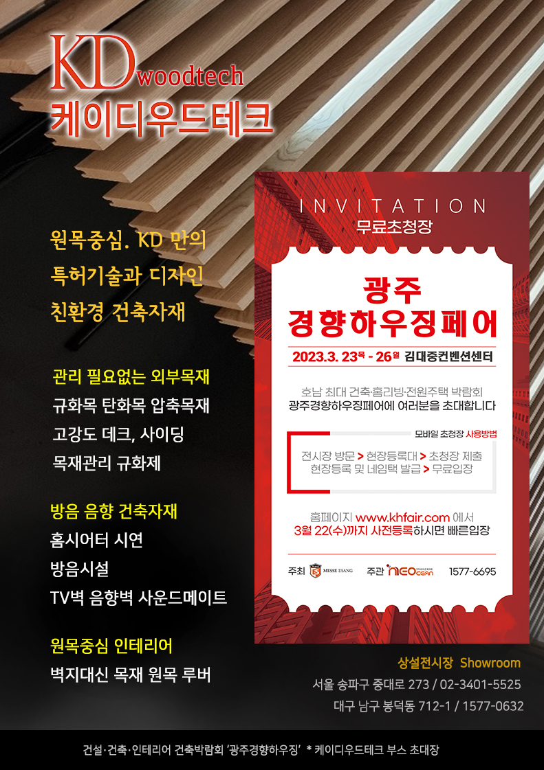 company > 공지사항 > 2023 광주경향하우징페어 KYUNGHYANG HOUNSING FAIR, 케이디우드테크 참가 무료초대장 안내