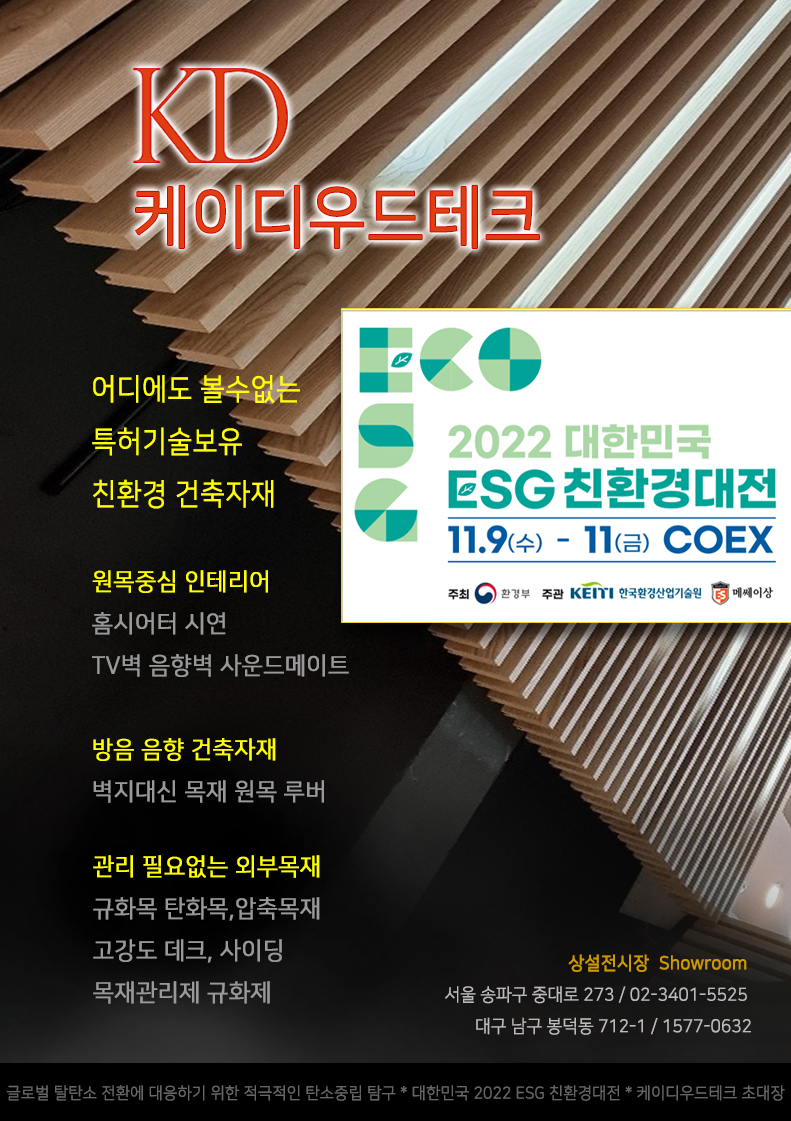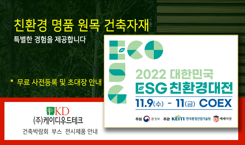케이디우드테크에서는 메쎄이상에서 주관하는 대한민국 ESG 친환경대전 박람회 건축부문에 초대를 받아 참가합니다.그간 오로지 원목 중심의 친환경 건축자재만은 개발 보급해온 저희 케이디우드테크는 인간과 자연, 지구와 미래세대를 존중하는 제품으로서 건축공간에 에너지를 불어넣고 아름다운 조화를 이루도록 모든 역량을 집중하겠습니다.