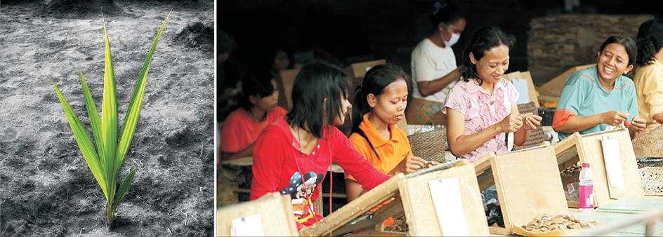 KD mosaic tile은 목재의 쓸모 없는 조각이나 코코넛 열매 껍질 등을 소재로 사용하여 만들어진다고 한다.  버려지는 자원을 활용하여 녹색 지구 환경에 도움을 주는 동시에 아트월이나 천장재, 바닥재로 인테리어 소재 선택의 폭을 넓혀주고 있다. 재료와 제품을 완성하기까지의 모든 과정에 친환경적 요소를 최대한 고려하여 만든 KD mosaic tile은 감각 높은 아티스트의 설계와 디자인, 그리고 숙련된 노동자의 노력으로 완성된다고 한다.  그들은 박스 포장이 끝나고 , 출하 준비가 될 때까지 KD mosaic tile의 생산에 들어가는 모든 지루한 공정의 대부분을 수작업으로 진행한다. 코코넛이나 목재의 주산지인 열대 우림의 저개발국가 등에서는 여전히 빈곤에 대항하여 수 백 만개의 일자리가 필요하고, 250m2 의 Coco mosaic tile 을 생산하기 위해서는, 최소한 한달 내내 바쁘게 일하는 40명의 근로자가 필요하다. 만약 전세계 디자이너들의 도움으로 1천만m2의 코코모자이크 타일이 생산된다면 환경보호에 일조하면서 동시에 160만개의 빈곤퇴치를 위한 일자리가 만들어지는 큰 성과가 만들어지는 것이다. 그러한 맥락에서 주거 및 상업 프로젝트에서 KD mosaic tile은 더욱 활성화 될 것으로 기대하고 있으며. 사회적 책임을 다하려는 몇몇 다국적 기업들이 이러한 제품에 주목하는 이유이기도 하다. 특히나 본 제품은 공정무역에 기초한 합리적인 가격으로 소비자에게 공급되고 있으며, 일반 가정에서도 누구나 아주 쉽게 시공을 할 수 있다., 유지 및 관리가 편하다는 것도 큰 장점이라고 할 수 있다.