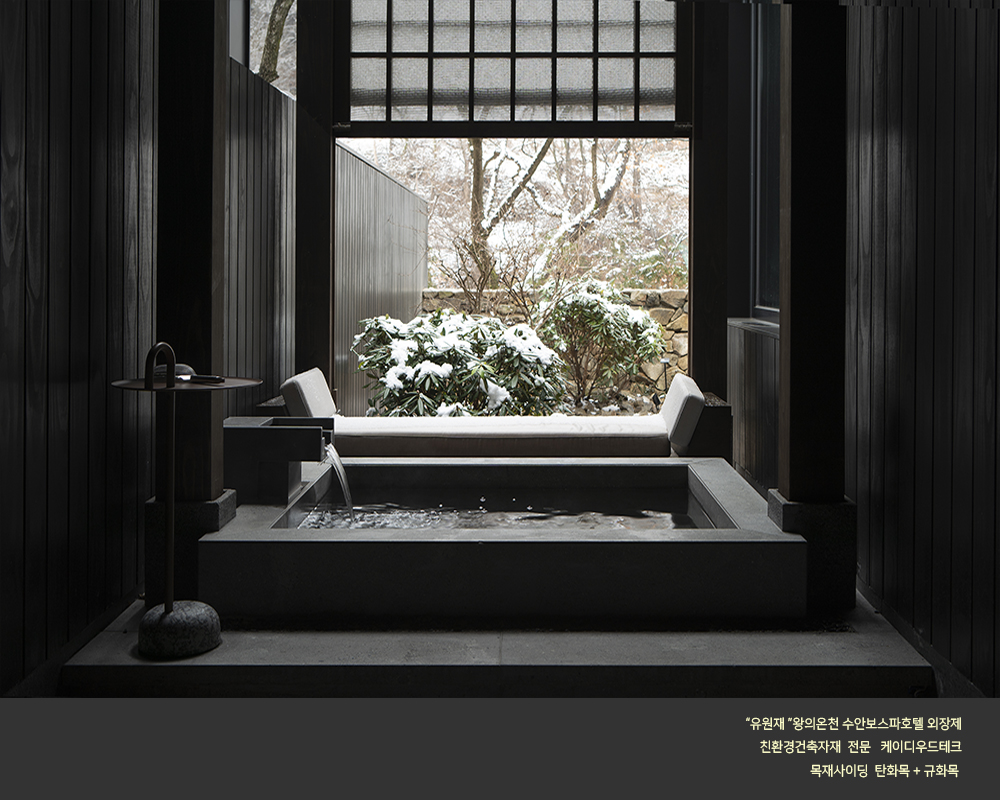 케이디우드테크에서 생산 공급하는 탄화목 ‘볼케이노 프라임’ 사이딩과 압축탄화목 “골드우드“ 데크가 수안보 온천 호텔 ‘유원재’에 시공되어 화제가 되고 있다. 유원재는 2023년9월 오픈되어 운영되고 있으며, 객실별 50평 규모의 정원과 노천탕을 보유한 온천 전문호텔이다. 유원재(留園斎)는 '하루 동안 정원을 보며 머무는 집'이라는 의미로서 이용객에게 전문 셰프의 저녁 코스요리와 다음날 조식 한상차림을 제공한다. 건축주인 이종호 ㈜티에스엠 회장은 "유원재는 이제껏 국내에 없었던 고품격 온천 전문 관광호텔"이라며 "전국 최고의 수질을 자랑하는 수안보 온천의 명성을 드높일 것"이라고 말했다. ‘99칸 한옥’을 현대적으로 재해석한 공간에 동남아 풀빌라나 일본 료칸에서 누릴 수 있는 ‘올 인클루시브’(all-inclusive·숙박료에 식사·부대시설 이용료가 모두 포함됨) 서비스를 접목시켰으며 국내외 예약이 쇄도하고 있다. 충주 수안보의 온천 호텔 ‘유원재’의 설계에 참여한 서경대 도시공학과 초빙교수 양진석 대표(와이그룹) 는 호텔의 외부 공간의 외벽과 내부 연결 공간에 블랙컬러의 탄화목과 규화목으로 중후함을 살렸다.