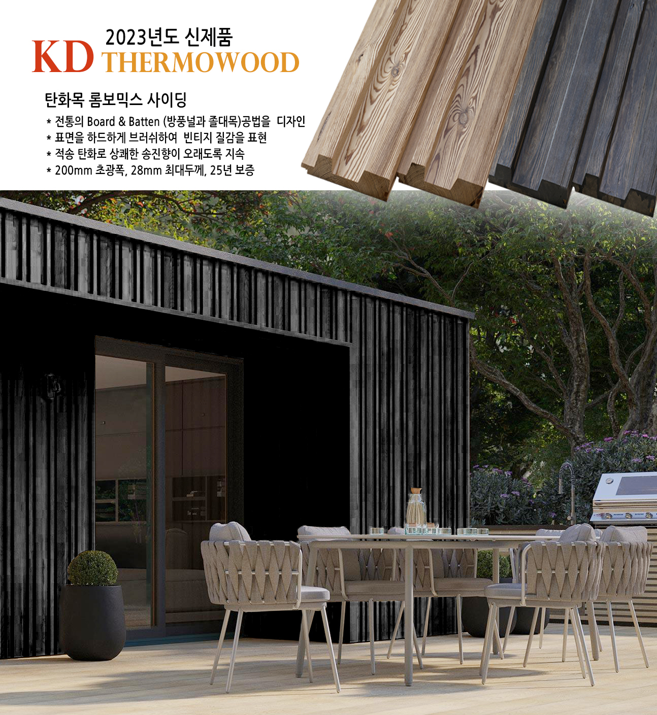통더욱 중후한 느낌의 28mm 두께의 블랙워시 목재 외장재 롬보사이딩을 출시했습니다.
