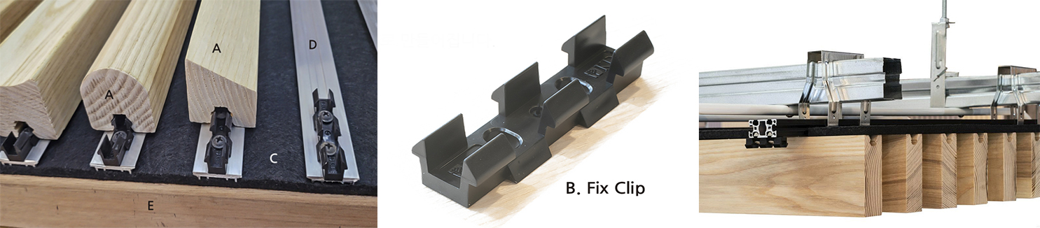 D 클립레일 : 알루미늄 재질 프로파일, 픽스클립의 위치 고정하고 흡음재 눌림을 방지합니다