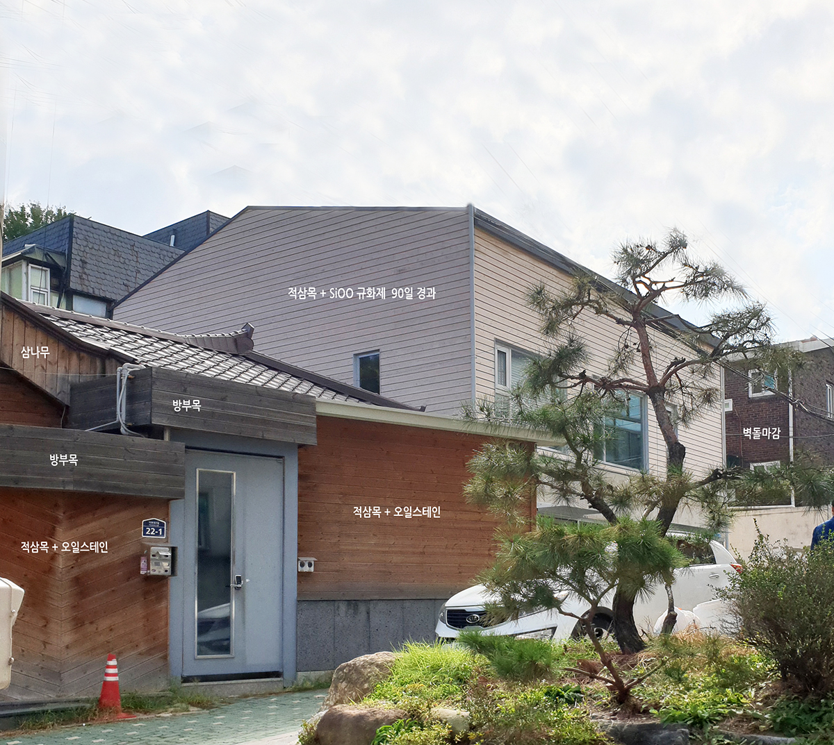 상가주택 신축 / 적삼목 외장재에 직접 도포