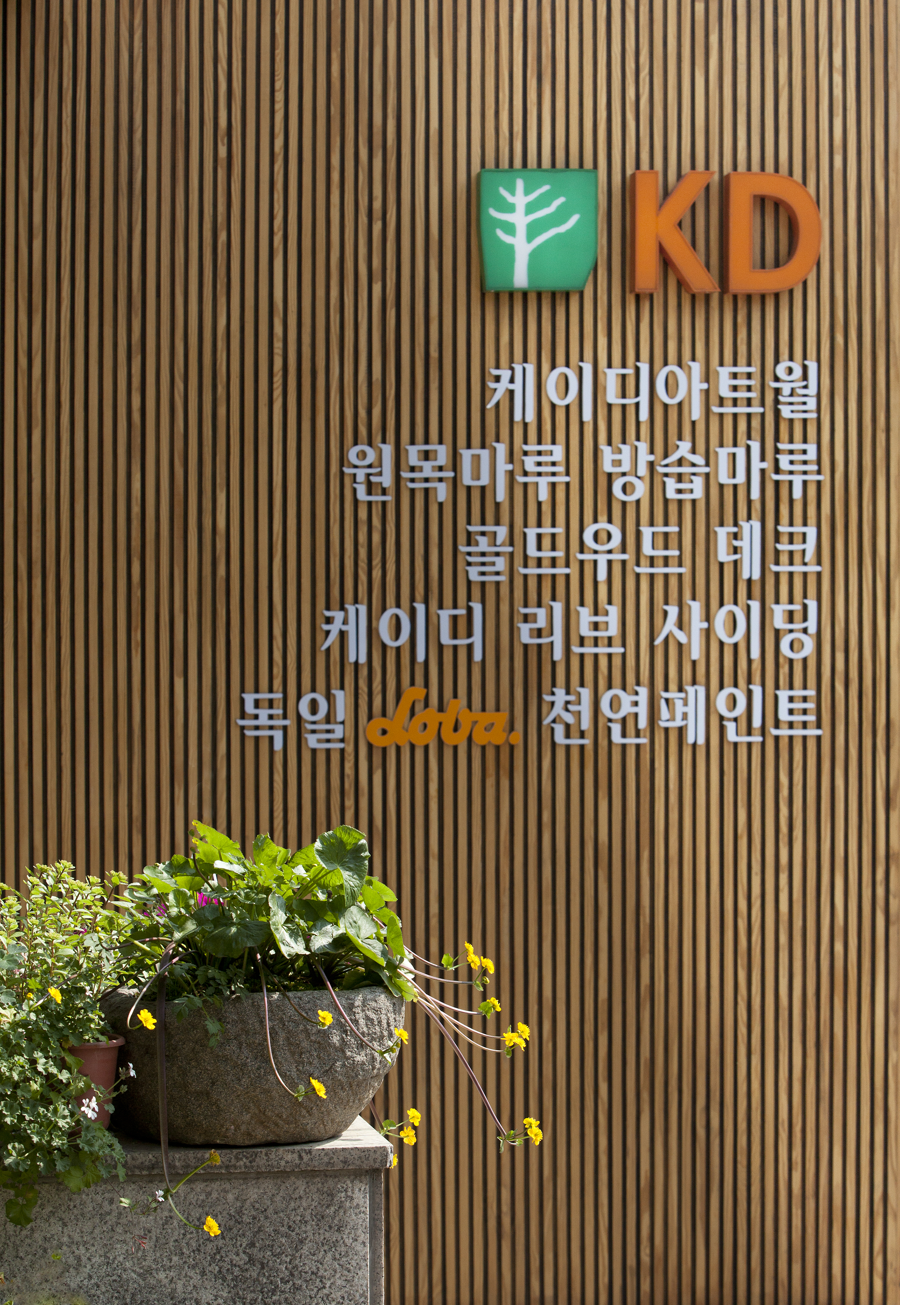 케이디우드테크 전시장 우측에 자리잡은 사인벽에