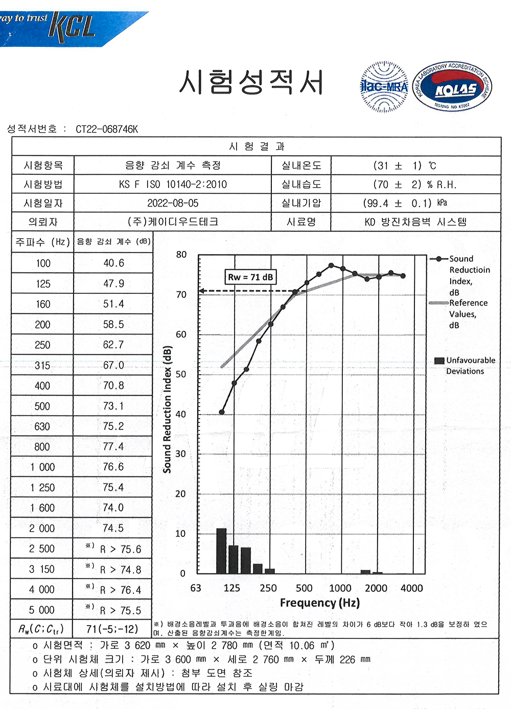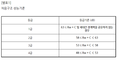 케이디우드테크에서 개발 보급하고 있는 <KD방진차음벽시스템>의 <가중음향감쇠계수 측정> 시험 결과 <Rw=71dB>을 값을 나타냈습니다. 이러한 성능수준은 국토교통부고시 제2018-776호에 의한 차음구조 성능기준 1등급(Rw<63dB) 기준을 월등하게 능가하는 구조로서 국내 최고의 성능이라고 할수 있습니다. . 한국건설생활환경연구원에 2022.8월 의뢰한 본 제품의 시험성적서는 위와 같습니다.