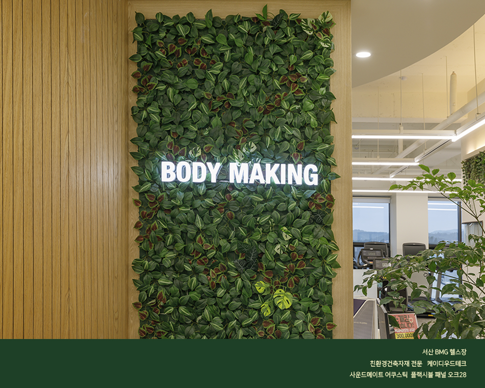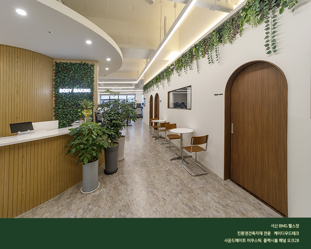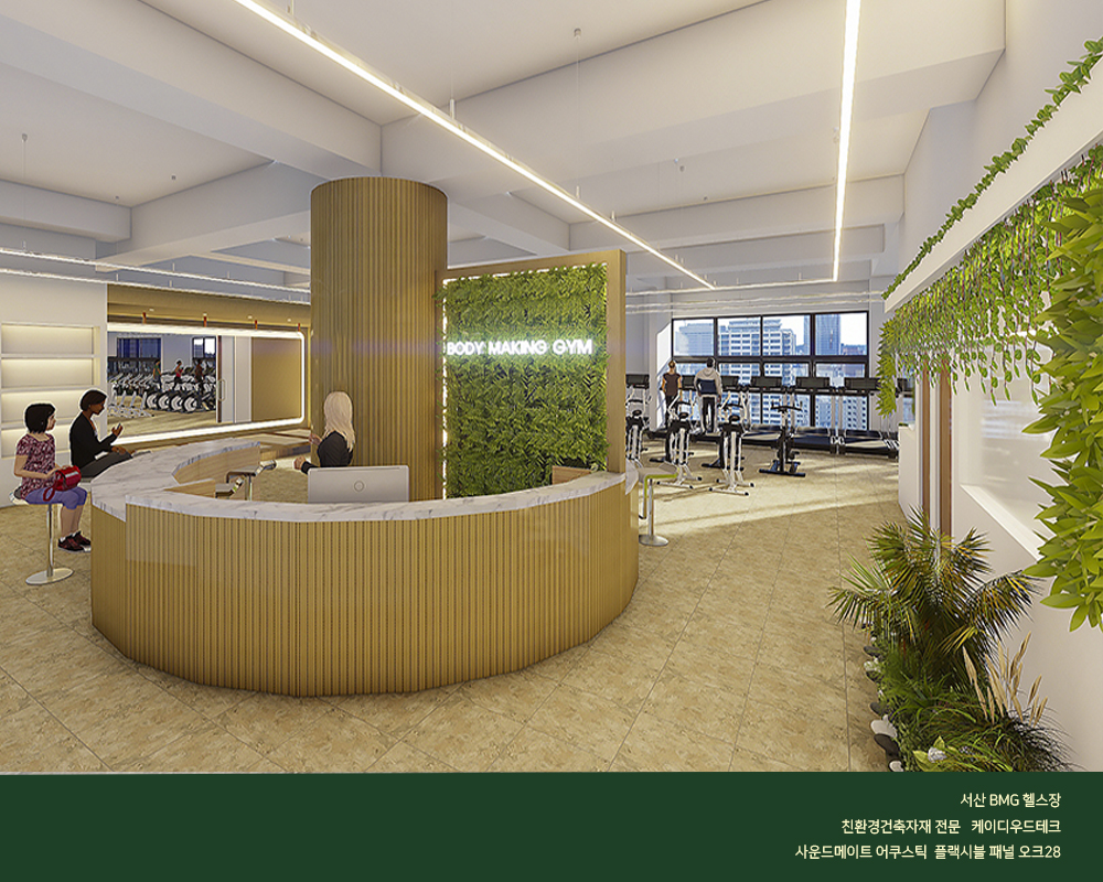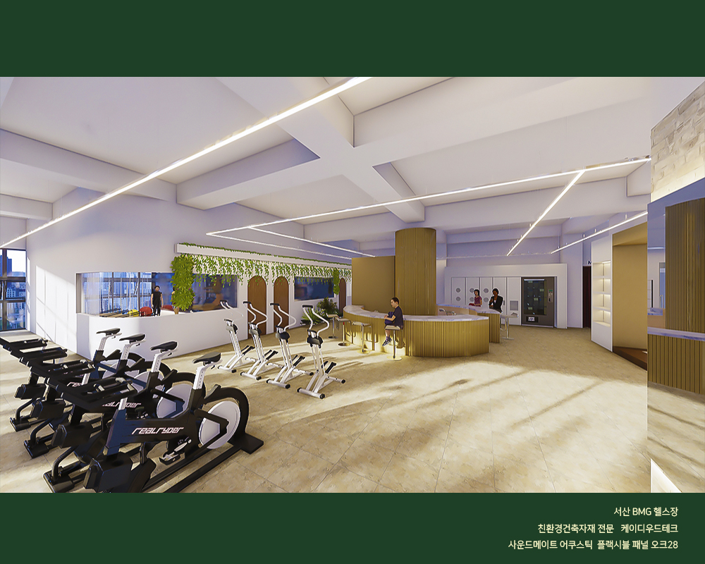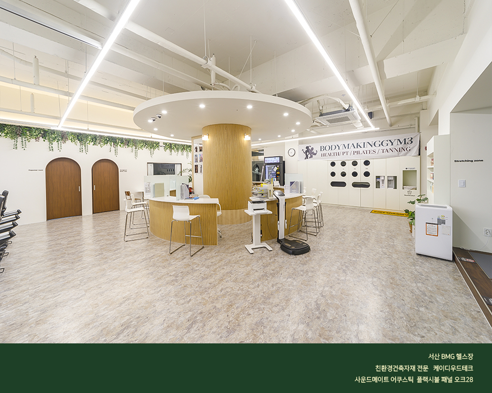곡면 시공인 자유로운 보드패널 흡음판 일체형으로서 헬스장의 소음을 줄여주는 획적인 신제품을 시공한 현장입니다